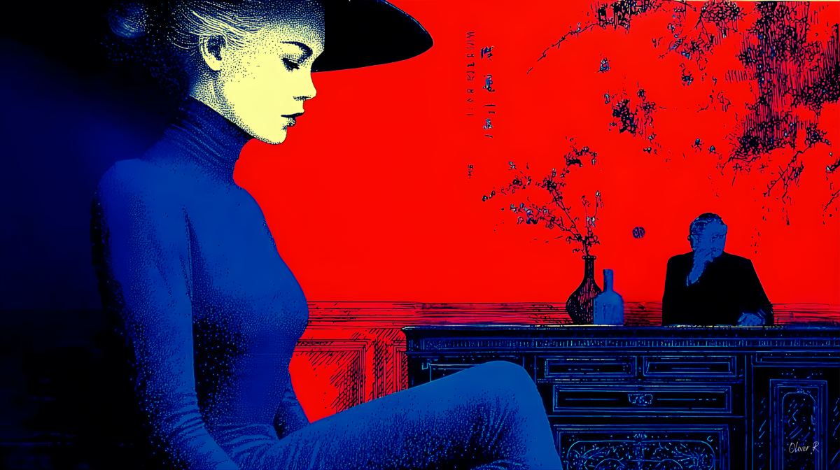 The implied wood may be interpreted as an enclosed, interior space, almost austere, contrasting with the expressive richness of the red dress. Thus, Oliver R. presents a female figure that is both fragile and powerful. The interplay of colors — scarlet red, cool blue, and subtle black — builds a visual and emotional tension. Anna Karenina is not merely a portrait; it becomes the image of a state of mind, of inner solitude, where posture, color, and light all contribute to a silent narrative.