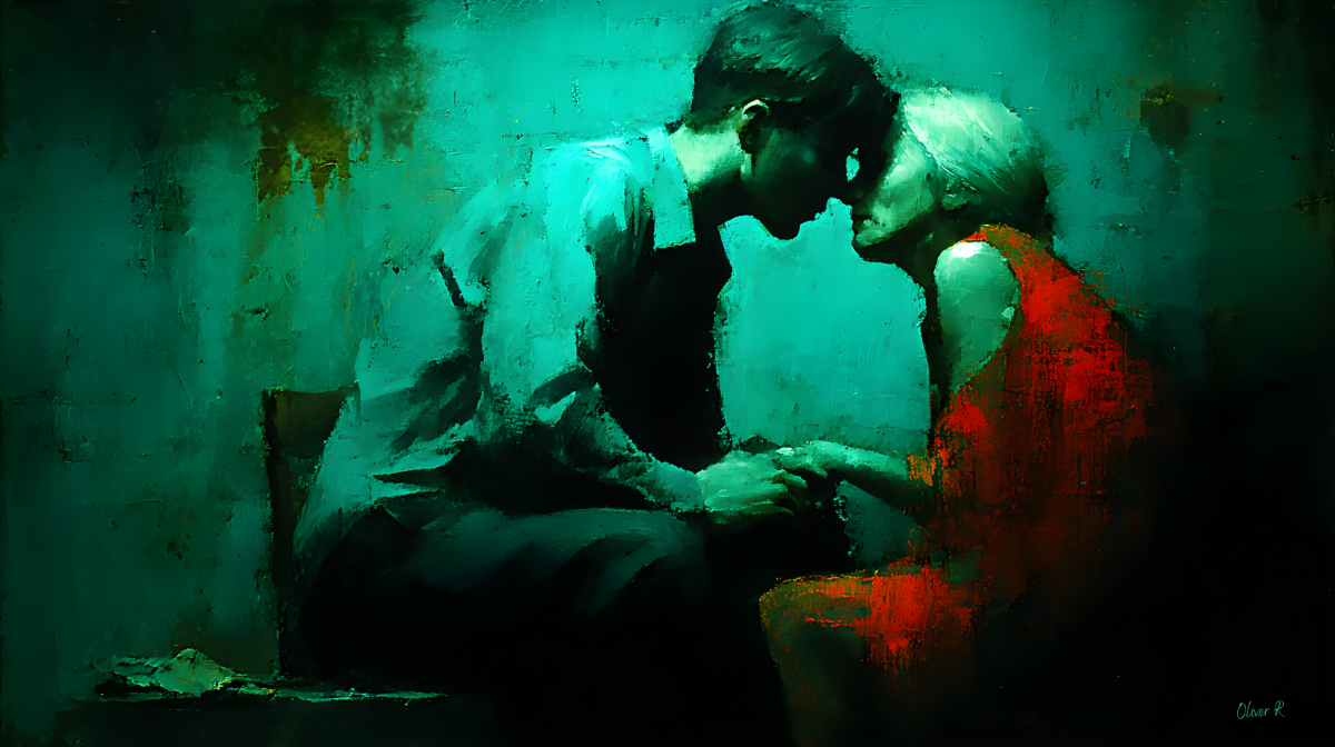 In The Power of Love, Oliver R explores a theme rarely depicted without judgment: love between two people whom everything seems to separate. The painting shows a young man and an older woman seated in profile in a dark, worn room. The scene feels intimate, almost suspended in time. The young man, dressed simply in a shirt and trousers, gently holds the woman’s hands. Their faces move closer together, as if they have just kissed or are about to.The woman, with white hair pulled back — perhaps gathered into a discreet bun disappearing at the nape of her neck — wears a red dress. It is difficult to tell whether the dress is worn with age or if it was once an elegant evening dress, short and revealing one shoulder. This detail adds ambiguity to her character, somewhere between past elegance and present fragility.The contrast between the strength of the feeling suggested by their gestures and the somber atmosphere of the room is striking. The space appears aged and neglected, as if the outside world weighs upon this unexpected relationship.Through this painting, Oliver R evokes the powerful and often criticized love between a twenty-five-year-old man and a seventy-year-old woman — an unlikely relationship that exists beyond social conventions. Despite the darkness of the setting, The Power of Love reminds us that the light of love can emerge where it is least expected.
